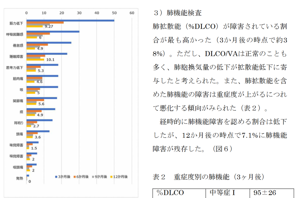 ・日本の研究でも約1/3が12ヶ月後もコロナ後遺症が続いていることも一致している(データ解析による6分間の歩行テストは、source2でも行われている。)。