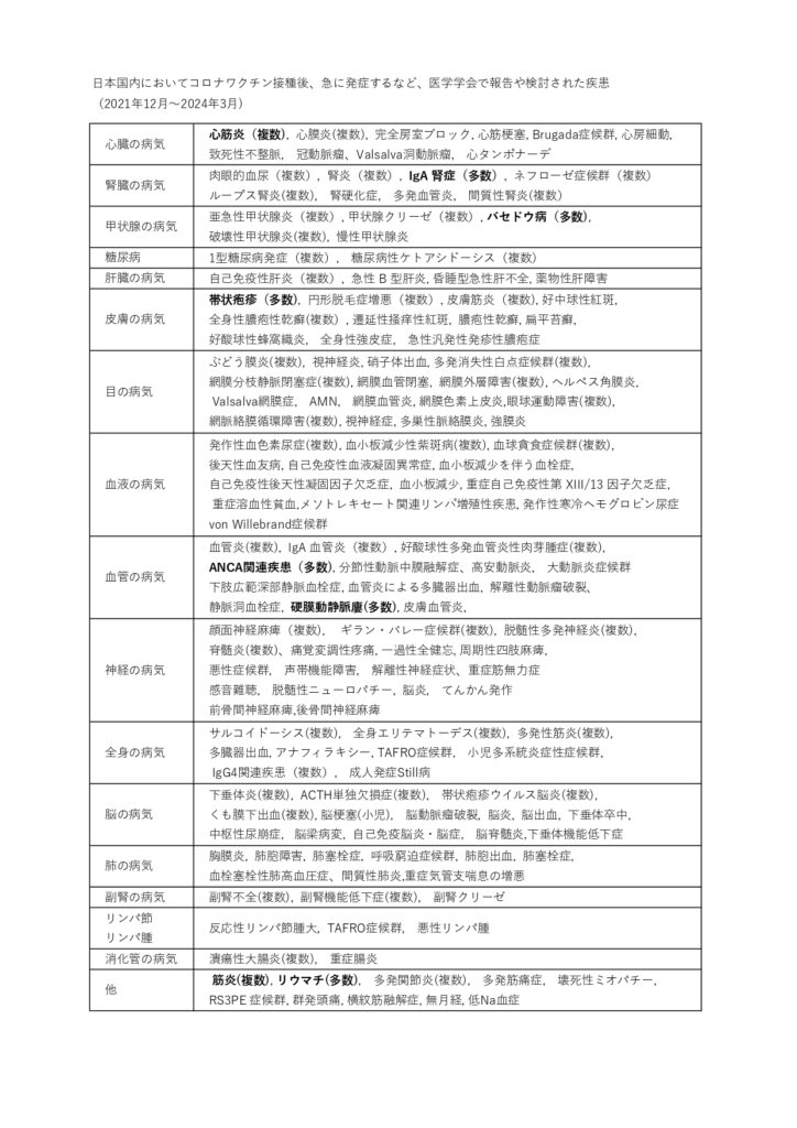 日本におけるコロナワクチンと疾患の関連報告(2021年12月~2024年3月)