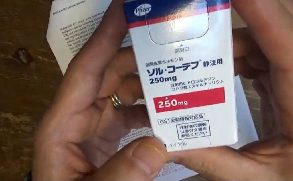ワクチン後症候群を診たら副腎皮質機能低下症(ナトリウム貯留できない/嘔吐/脱水/意識障害)を疑い(ソル・コーテフ/ヒドロコルチゾン/250mg/画像)を準備。
