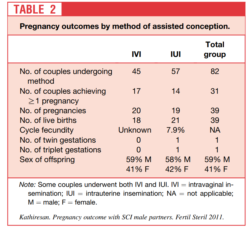 source/Pregnancy outcomes by intravaginal and intrauterine insemination in 82 couples with male factor infertility due to spinal cord injuries