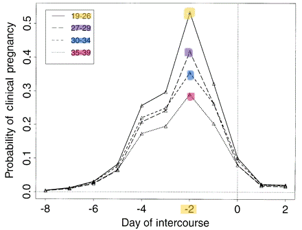 ・女性は、すべての年齢層において排卵2日前が妊娠しやすい時期であることが分かります。