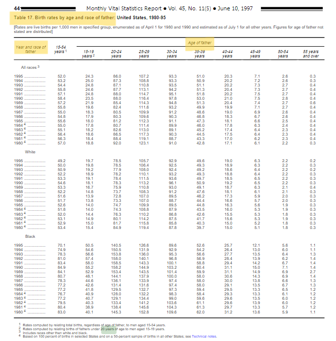 35歳以上の男性の生殖能力が1980年代から上昇しているのがデータとして示されてます(理由不明)。source/Report of final natality statistics, 1995
